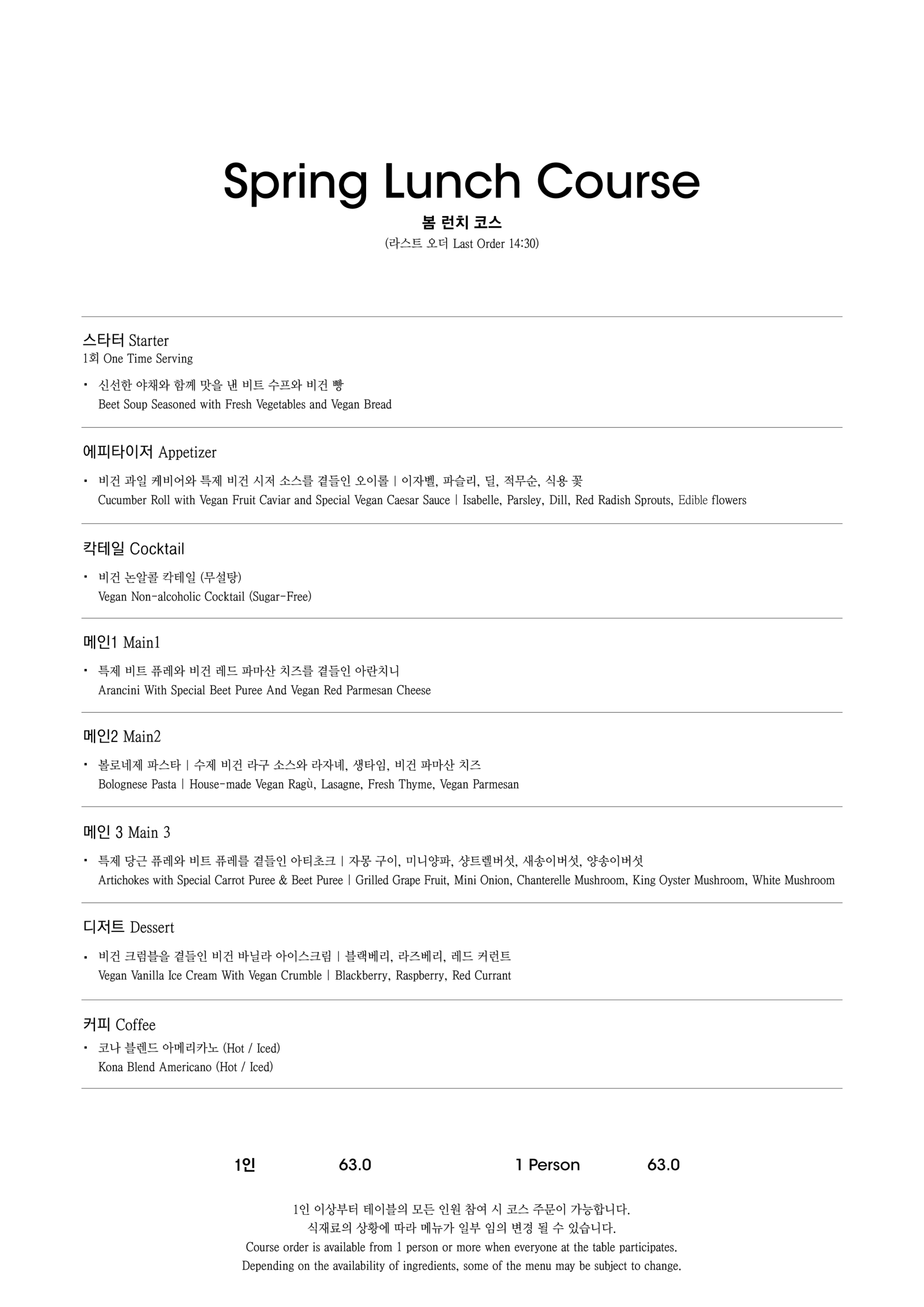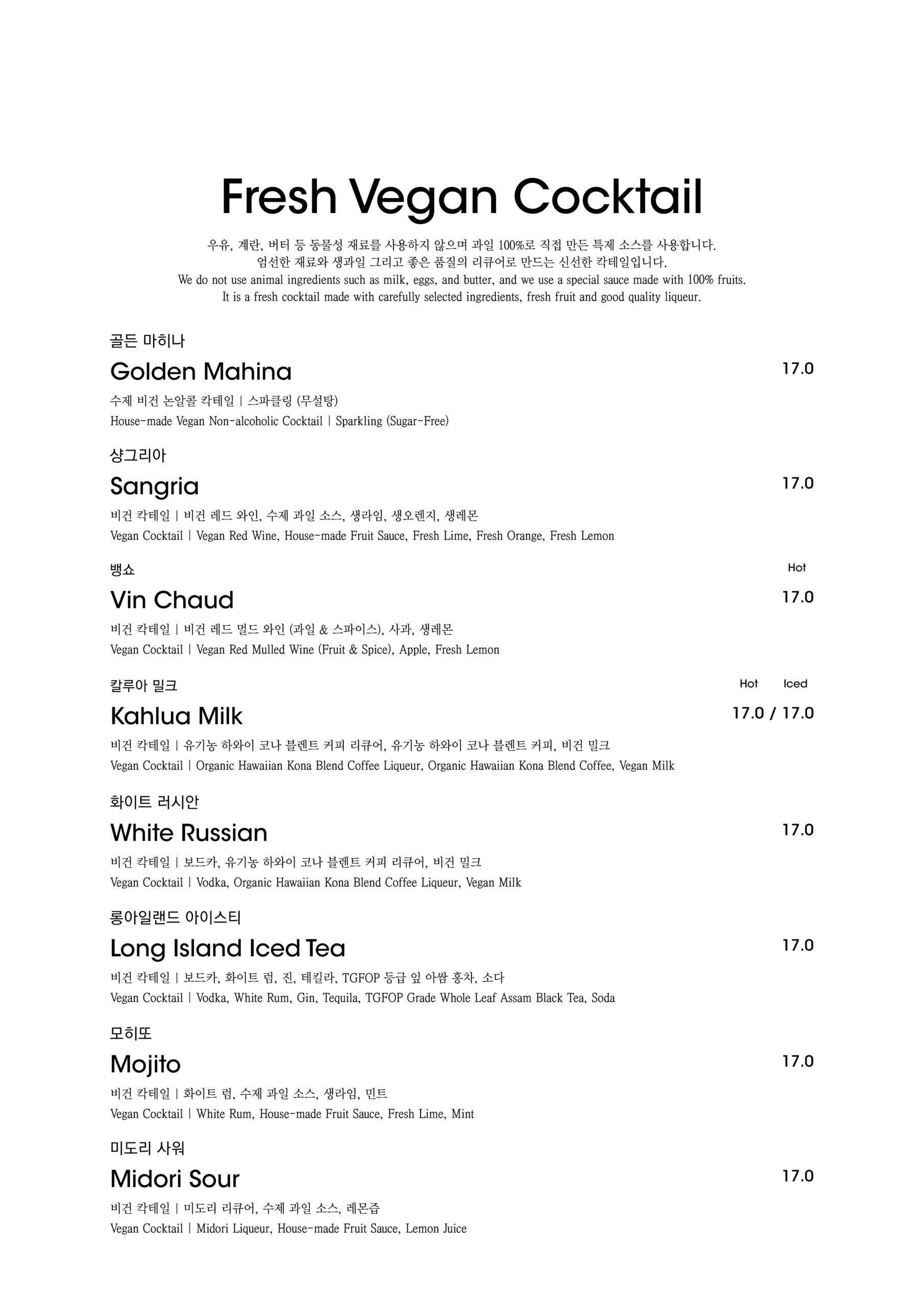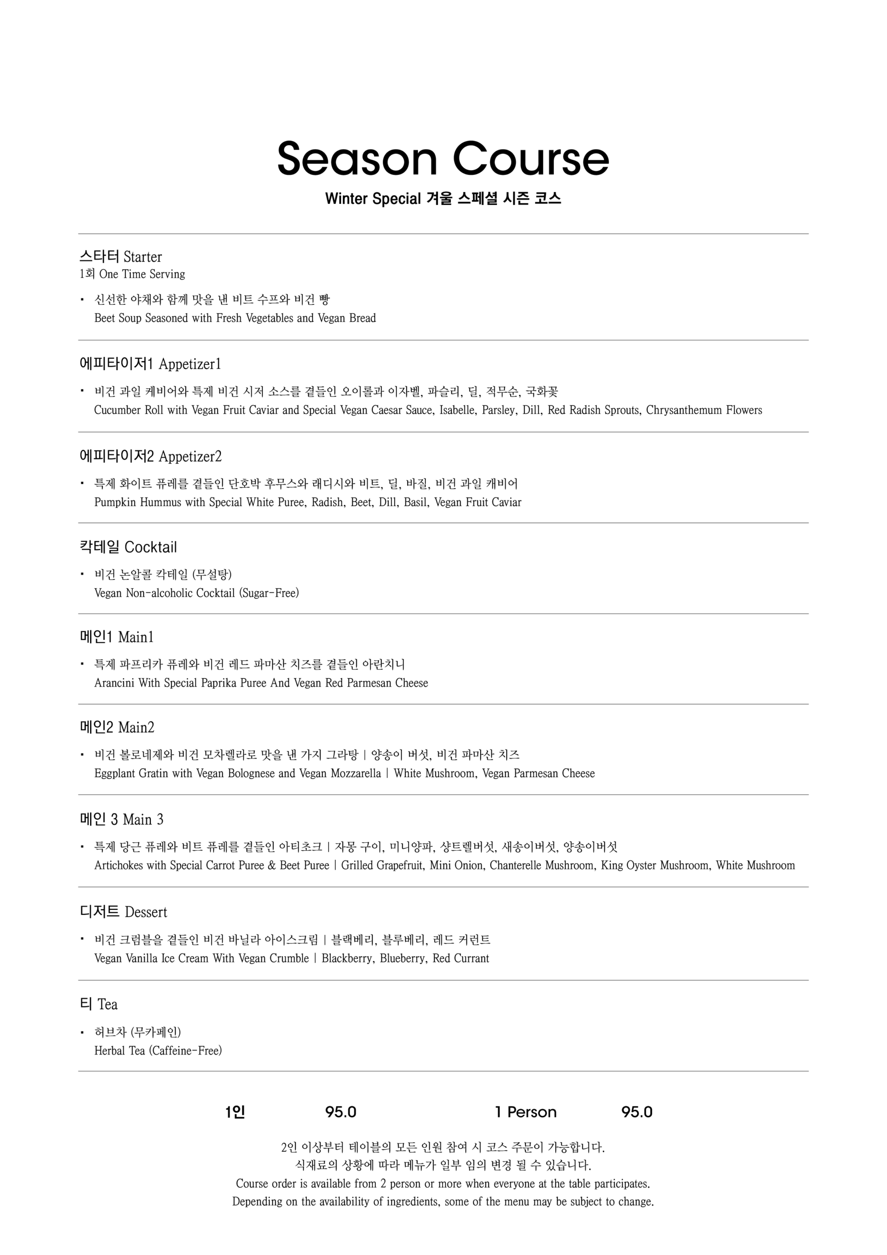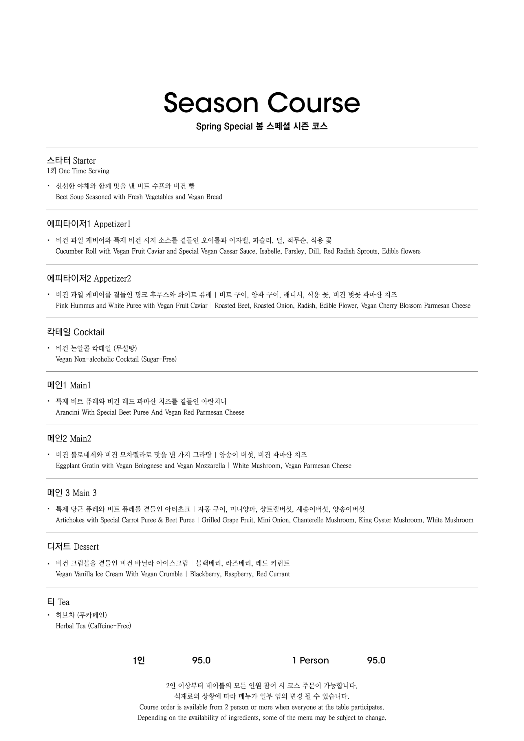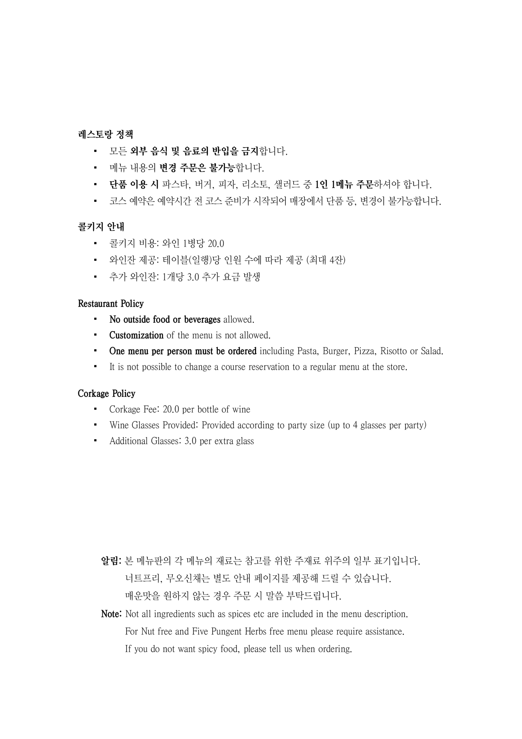 알림: 본 메뉴판의 각 메뉴의 재료는 참고를 위한 주재료 위주의 일부 표기입니다.