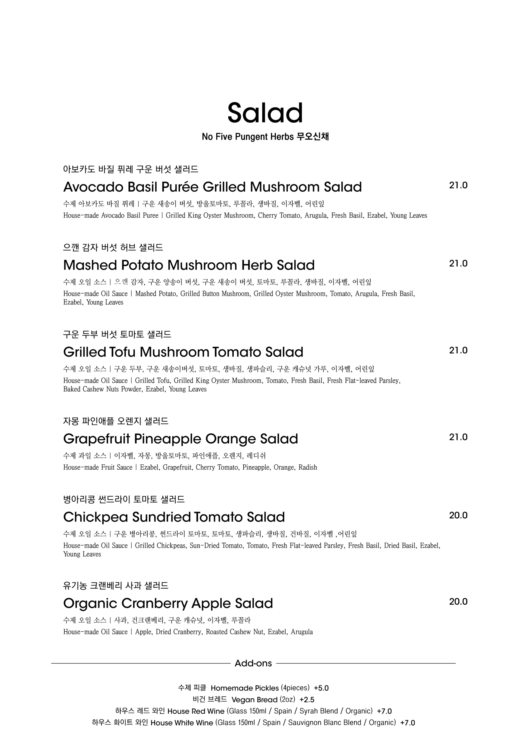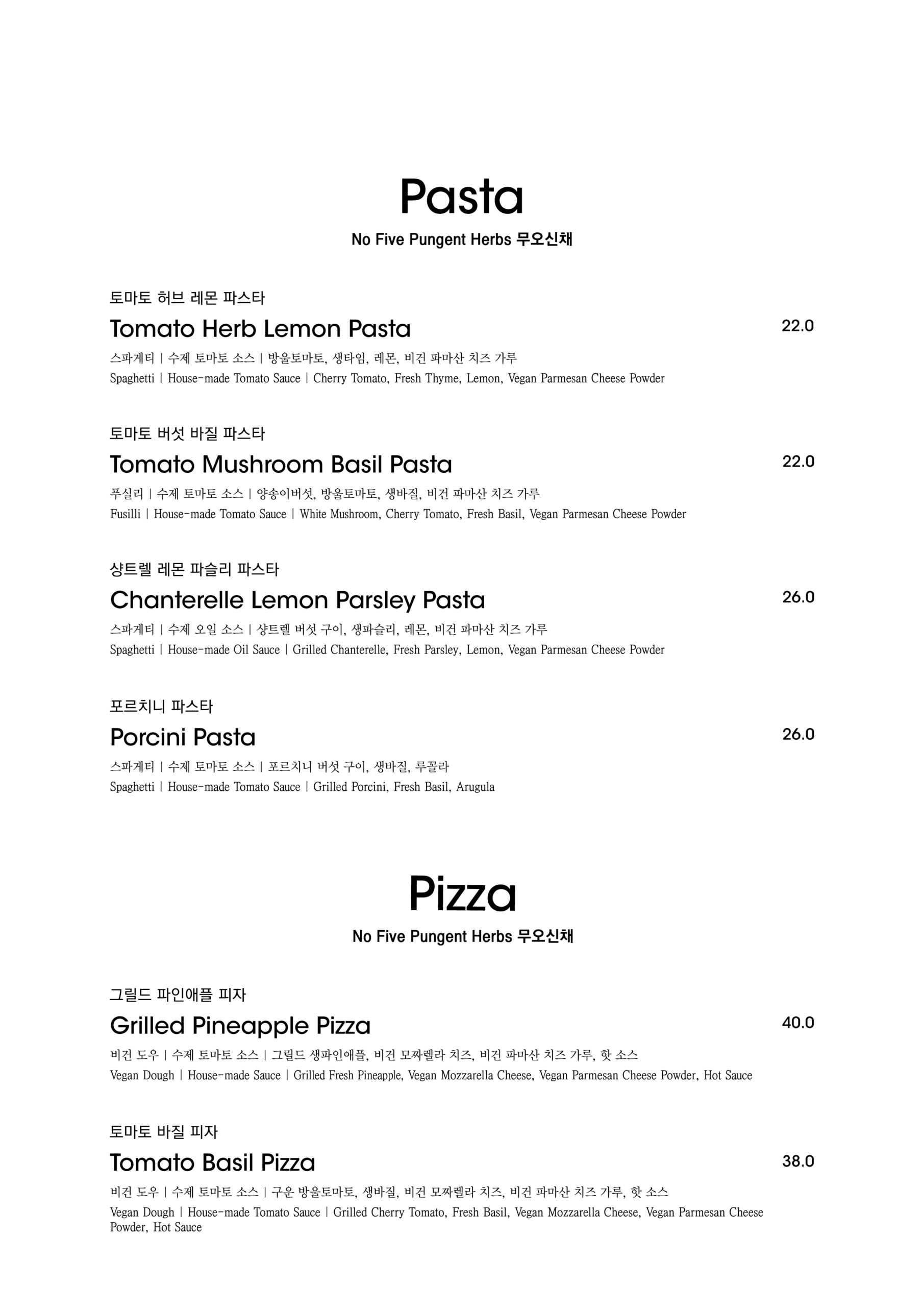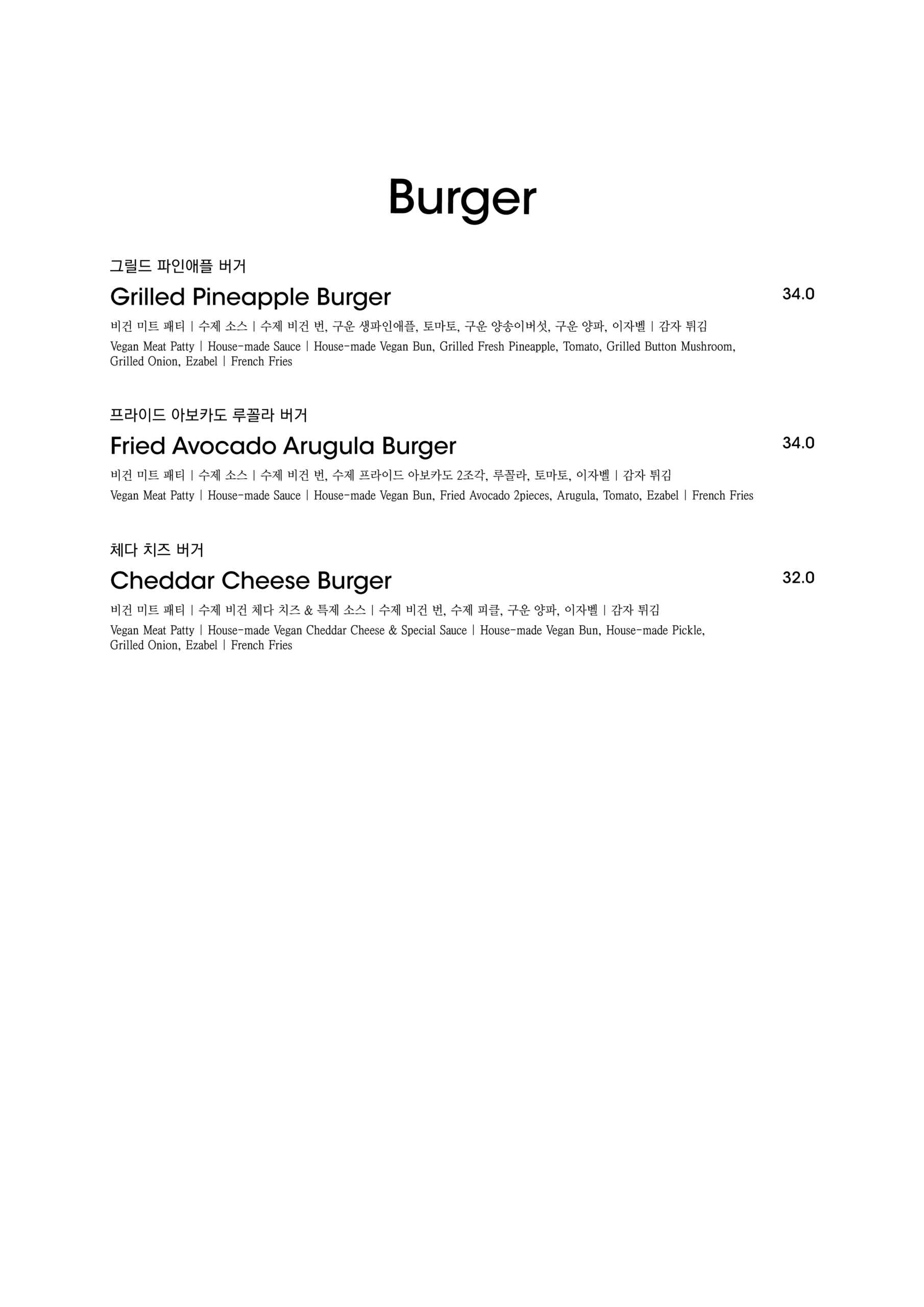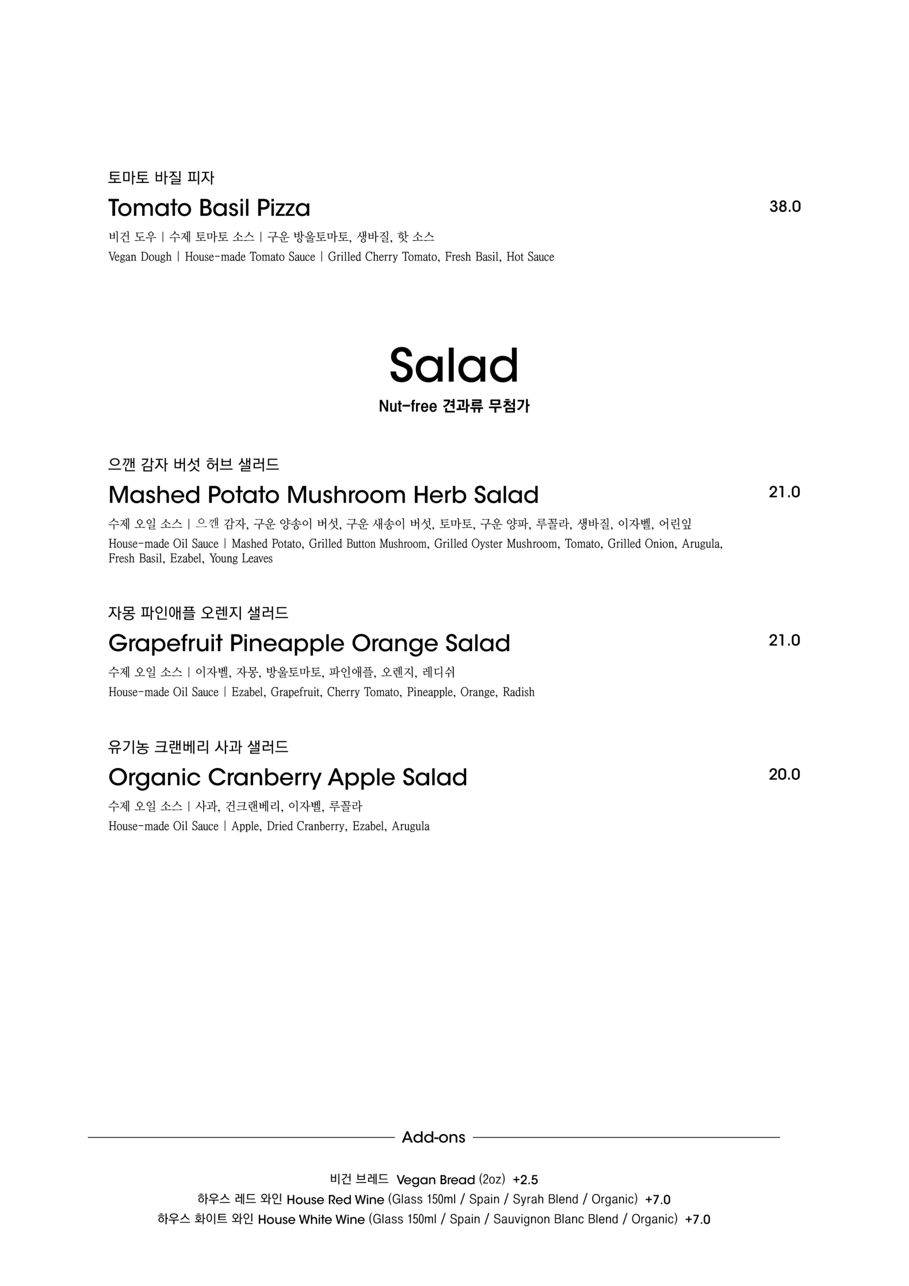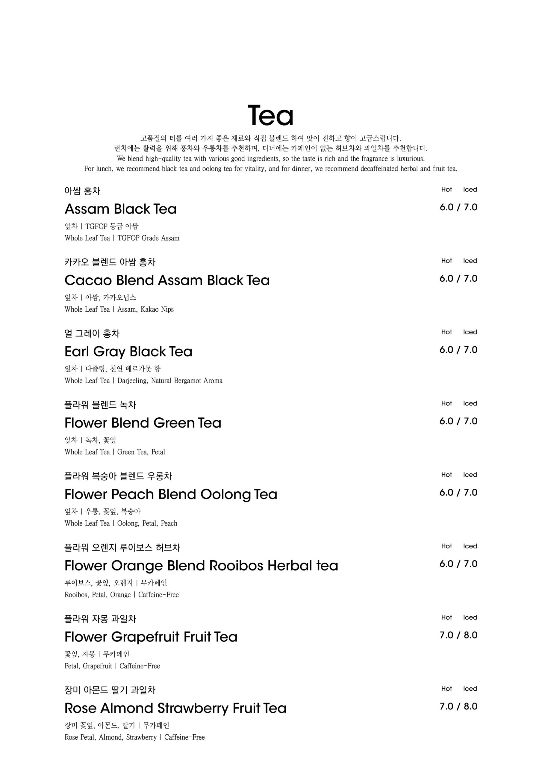 알림: 본 메뉴판의 각 메뉴의 재료는 참고를 위한 주재료 위주의 일부 표기입니다.