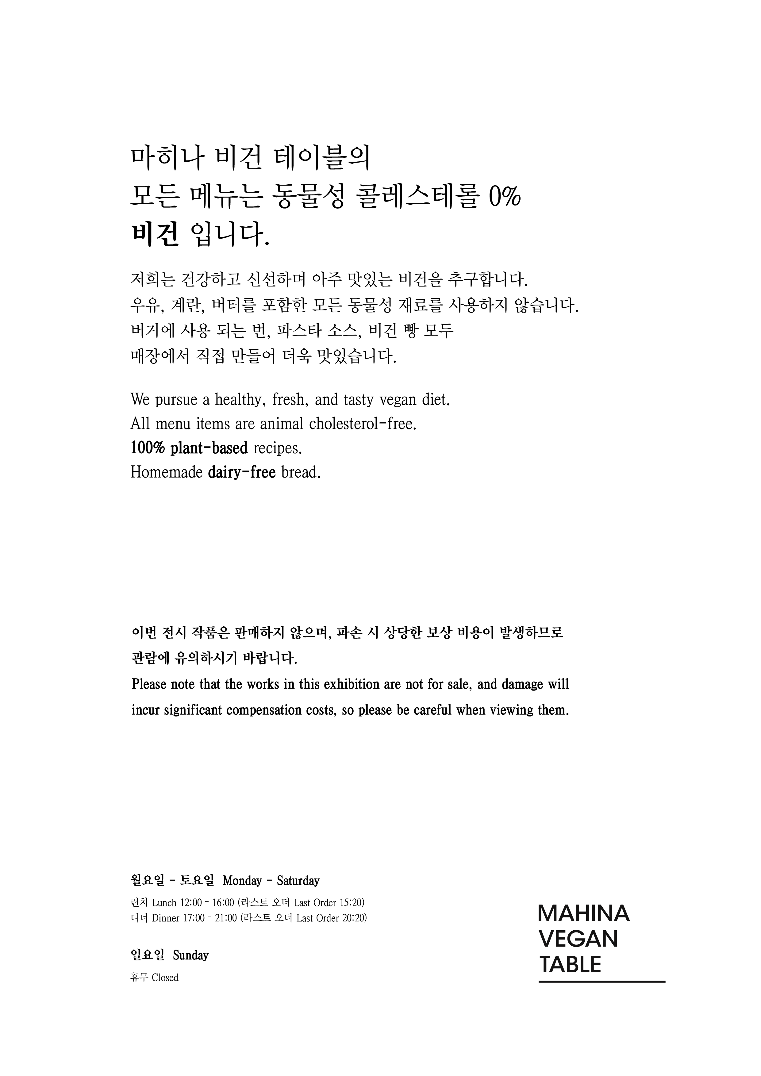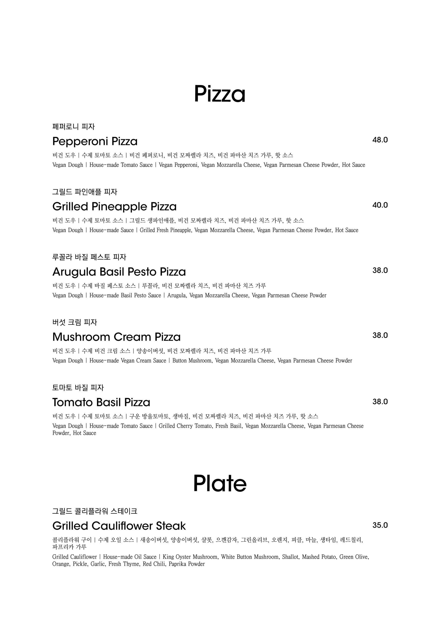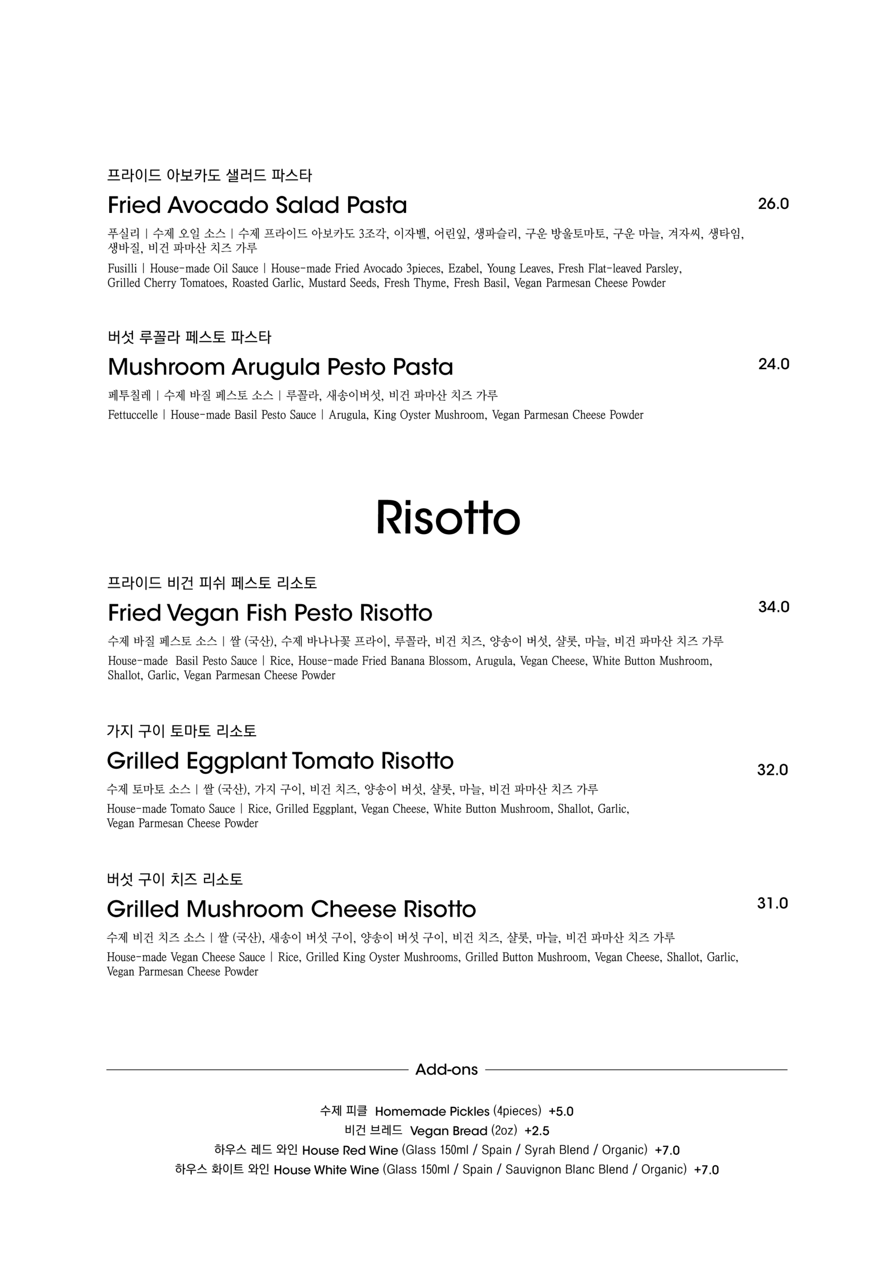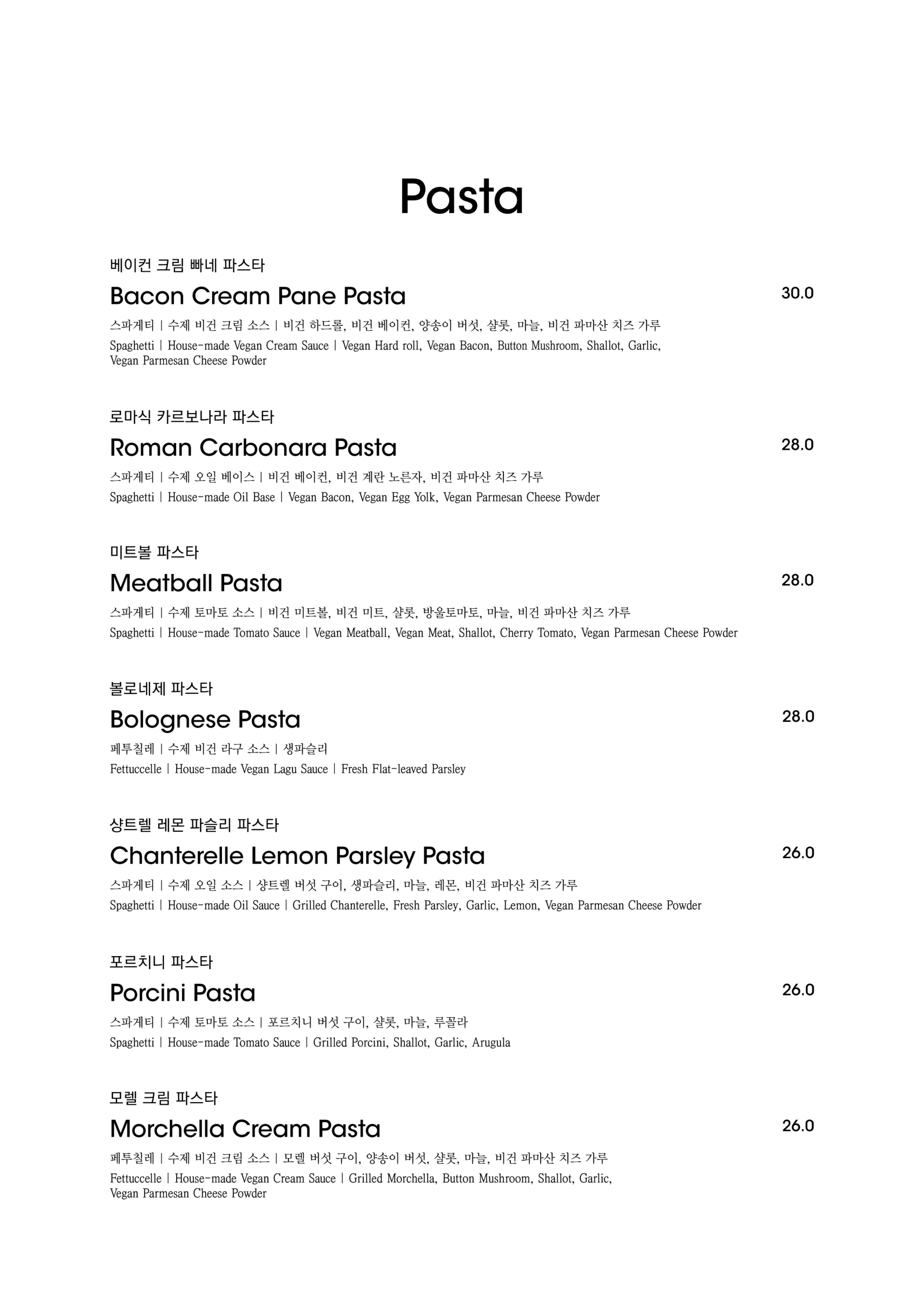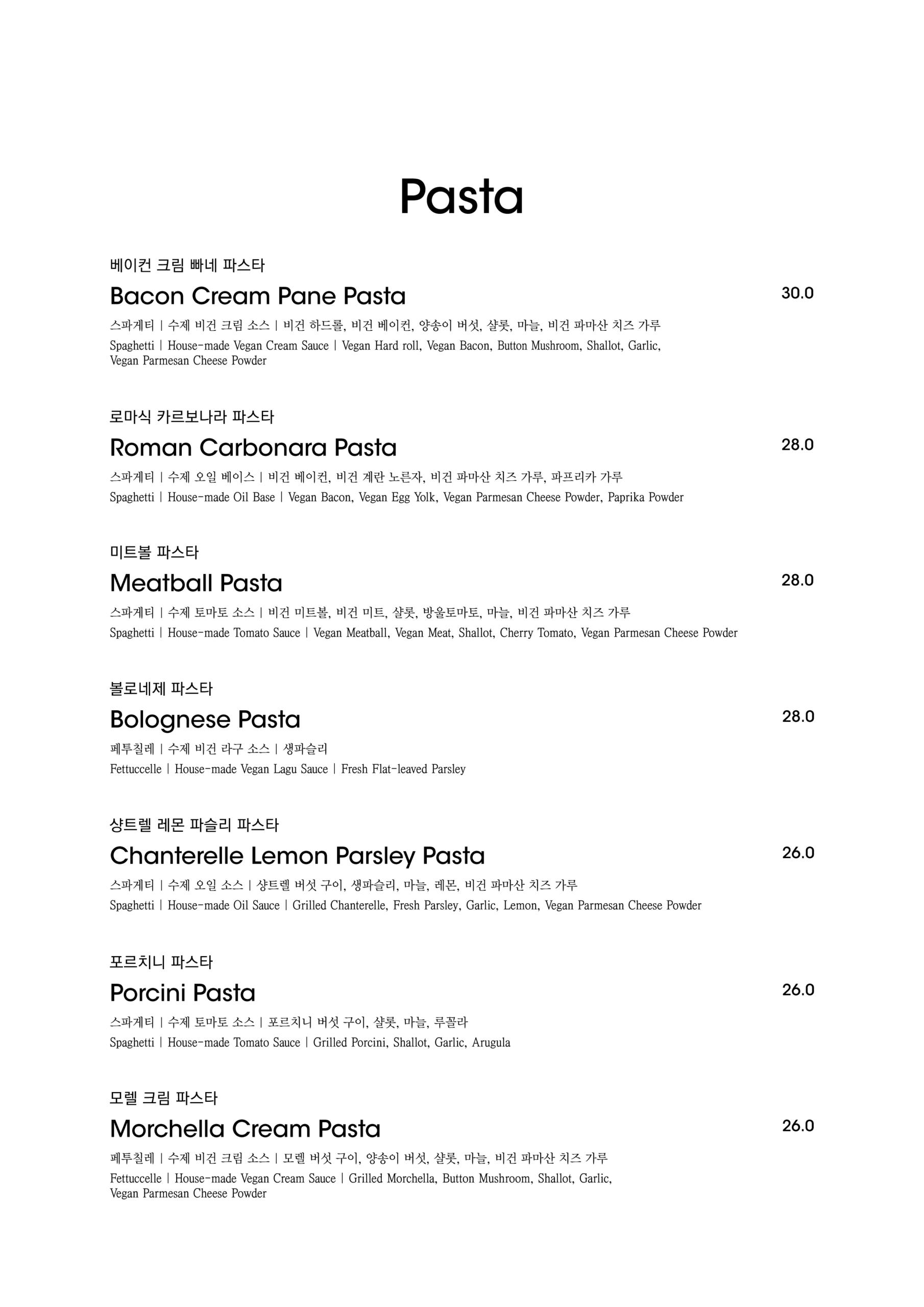 알림: 본 메뉴판의 각 메뉴의 재료는 참고를 위한 주재료 위주의 일부 표기입니다.