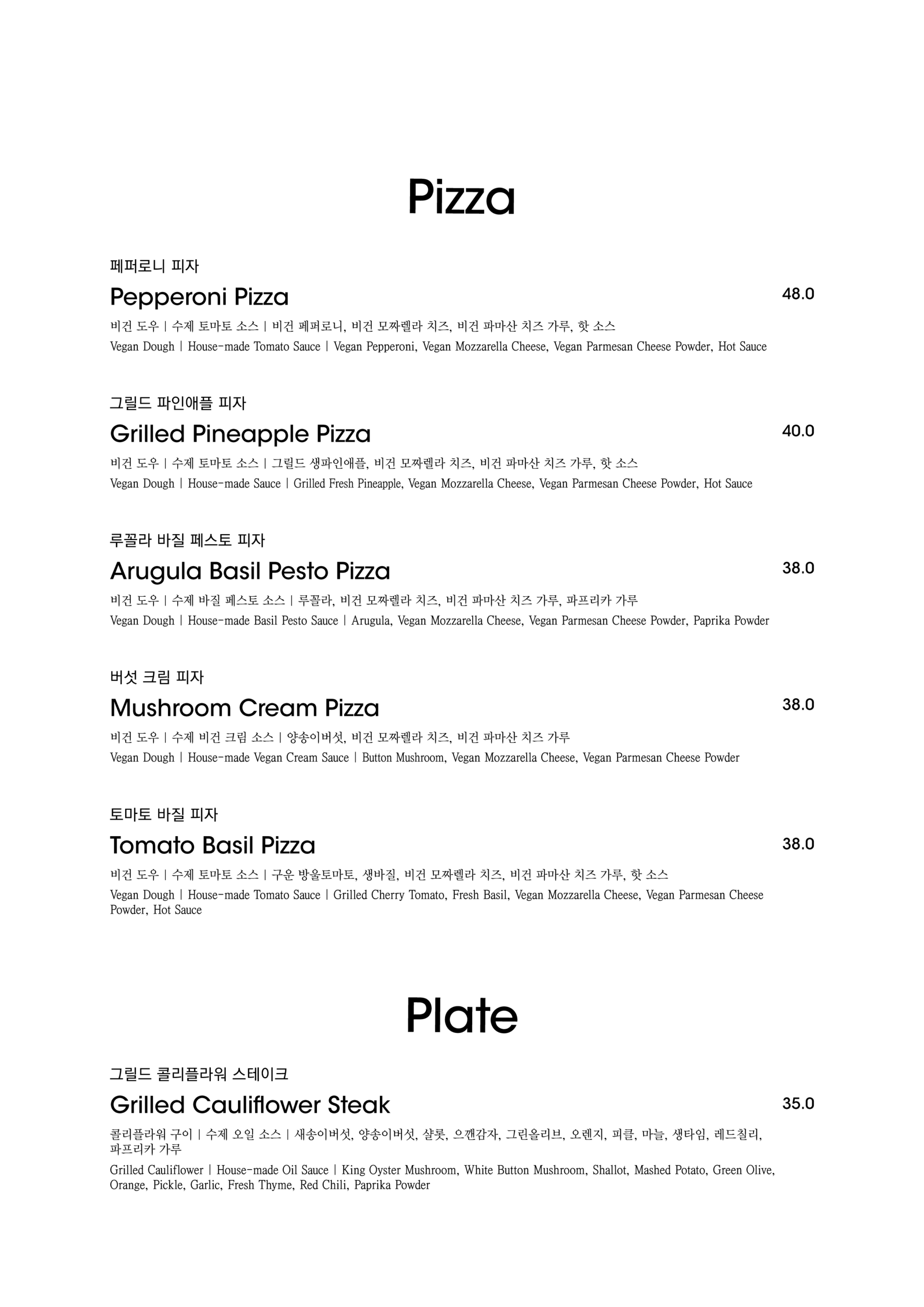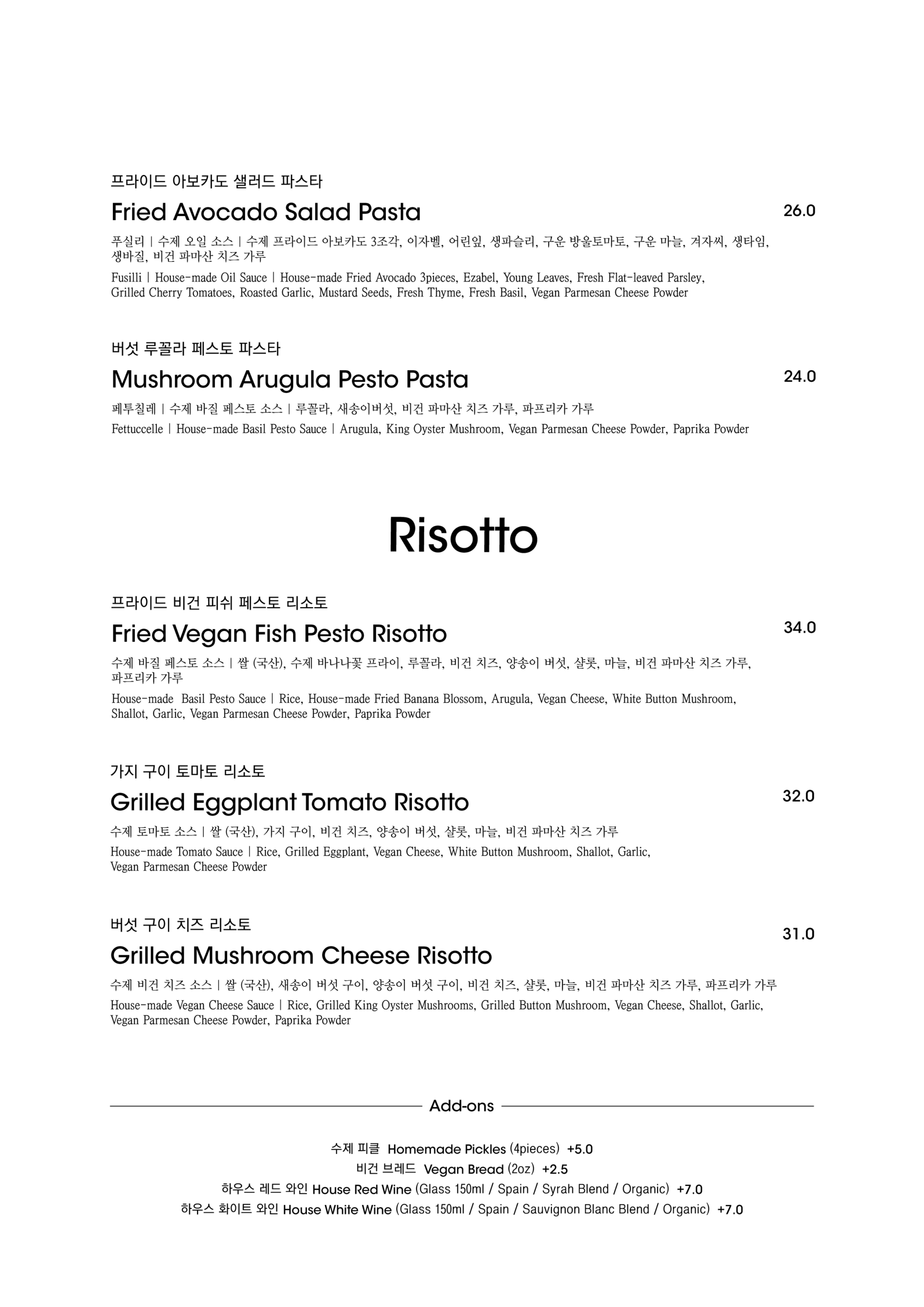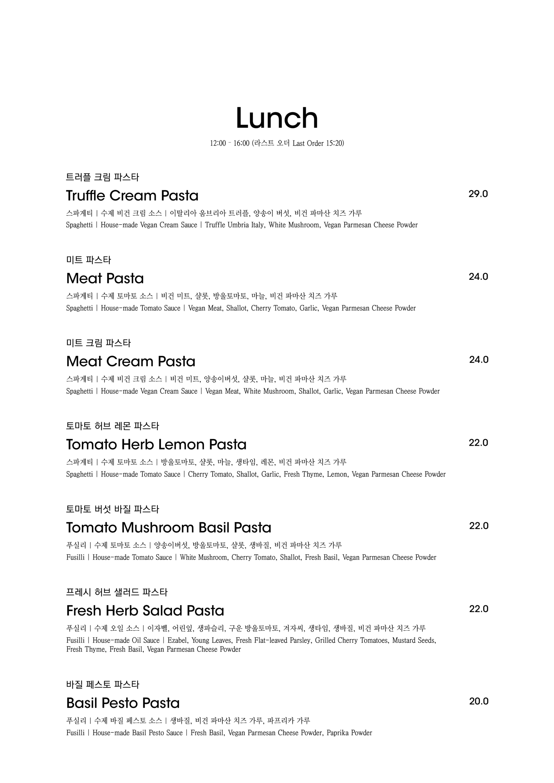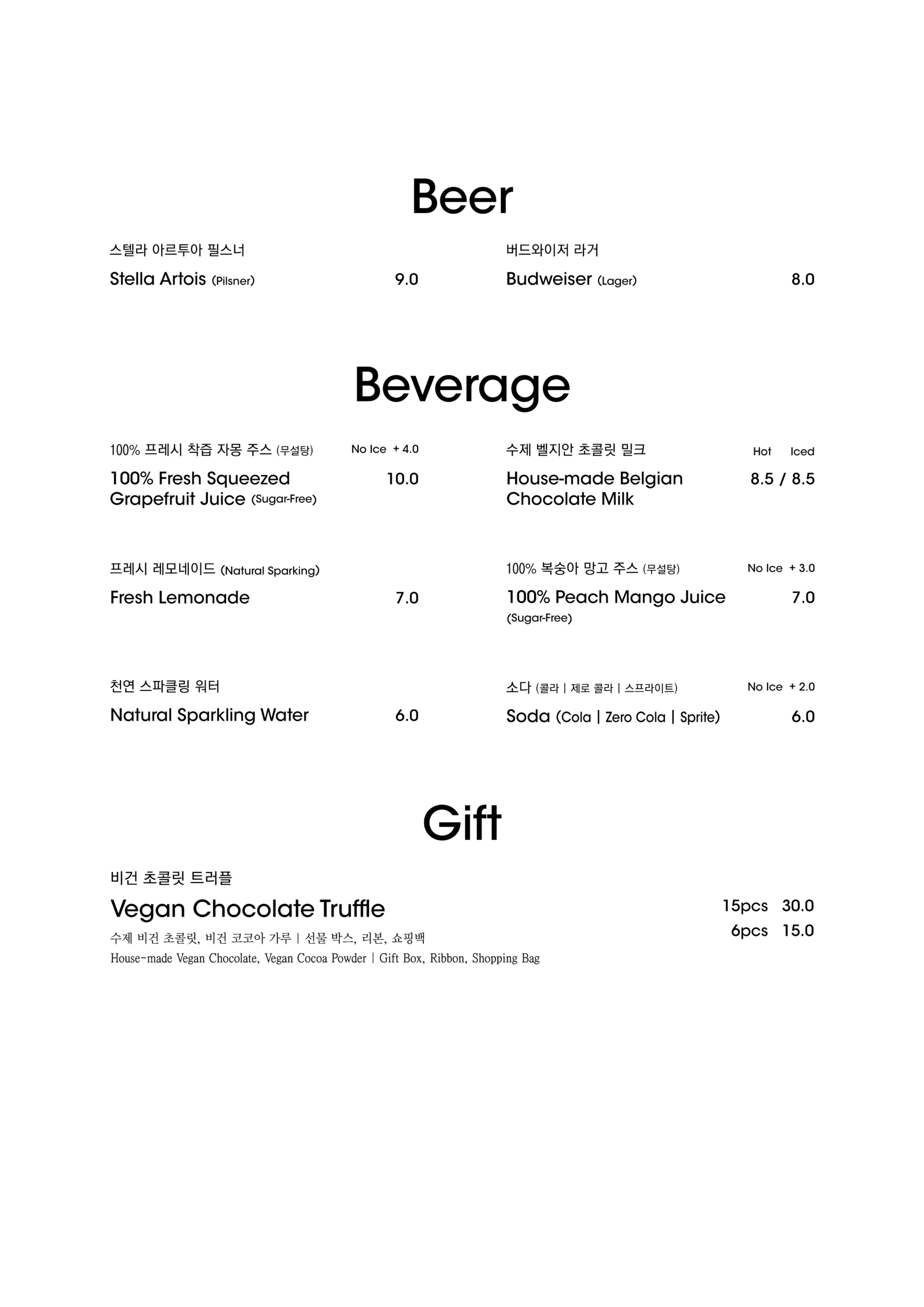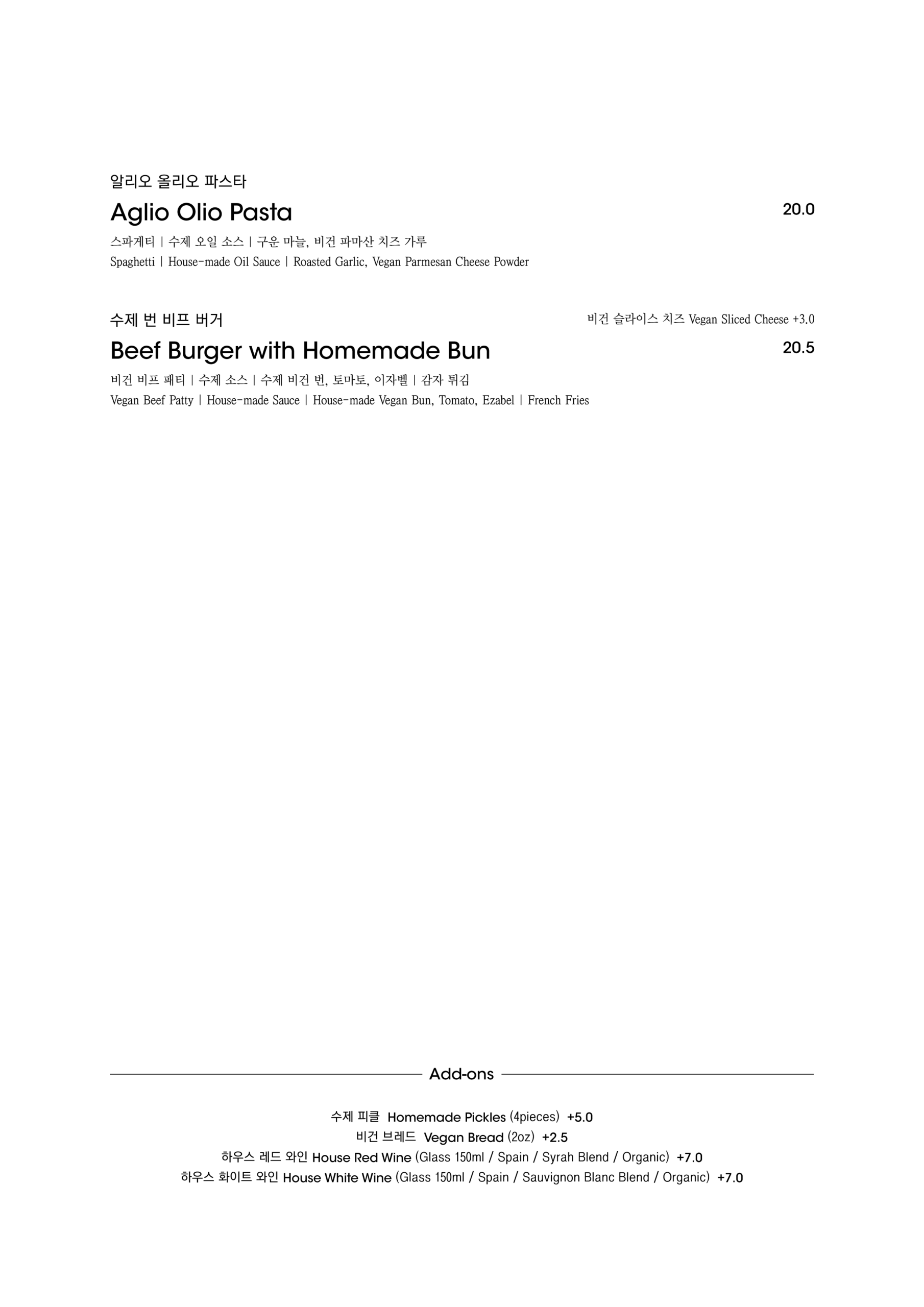알림: 본 메뉴판의 각 메뉴의 재료는 참고를 위한 주재료 위주의 일부 표기입니다.