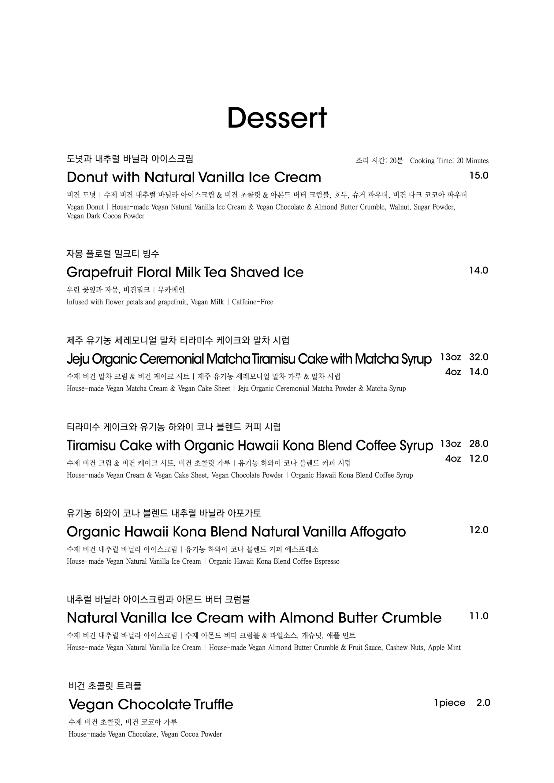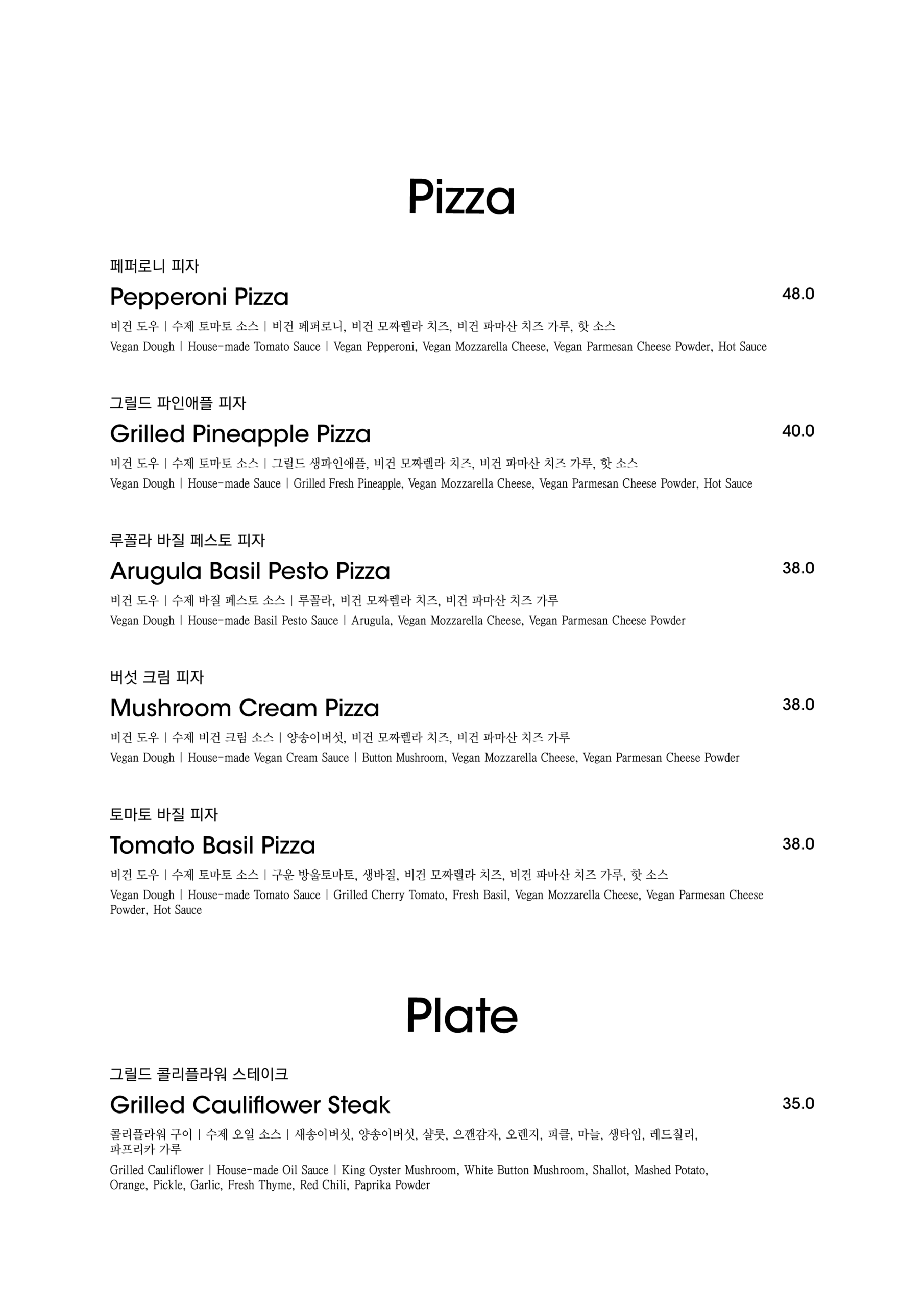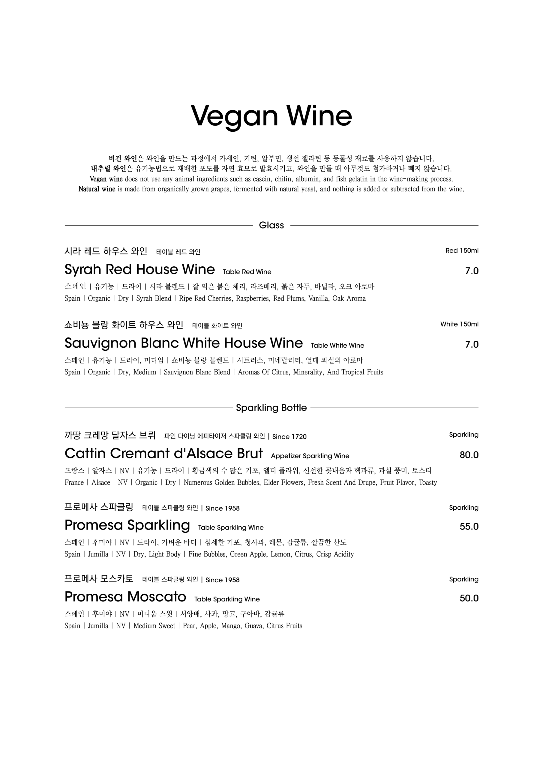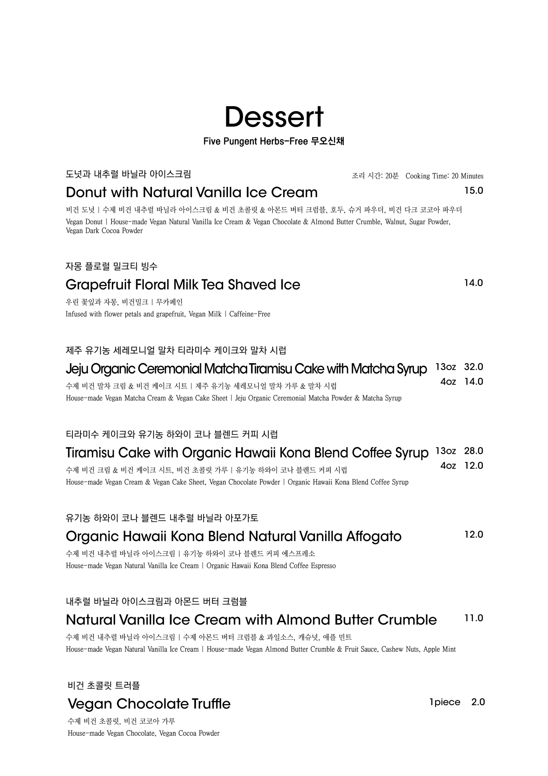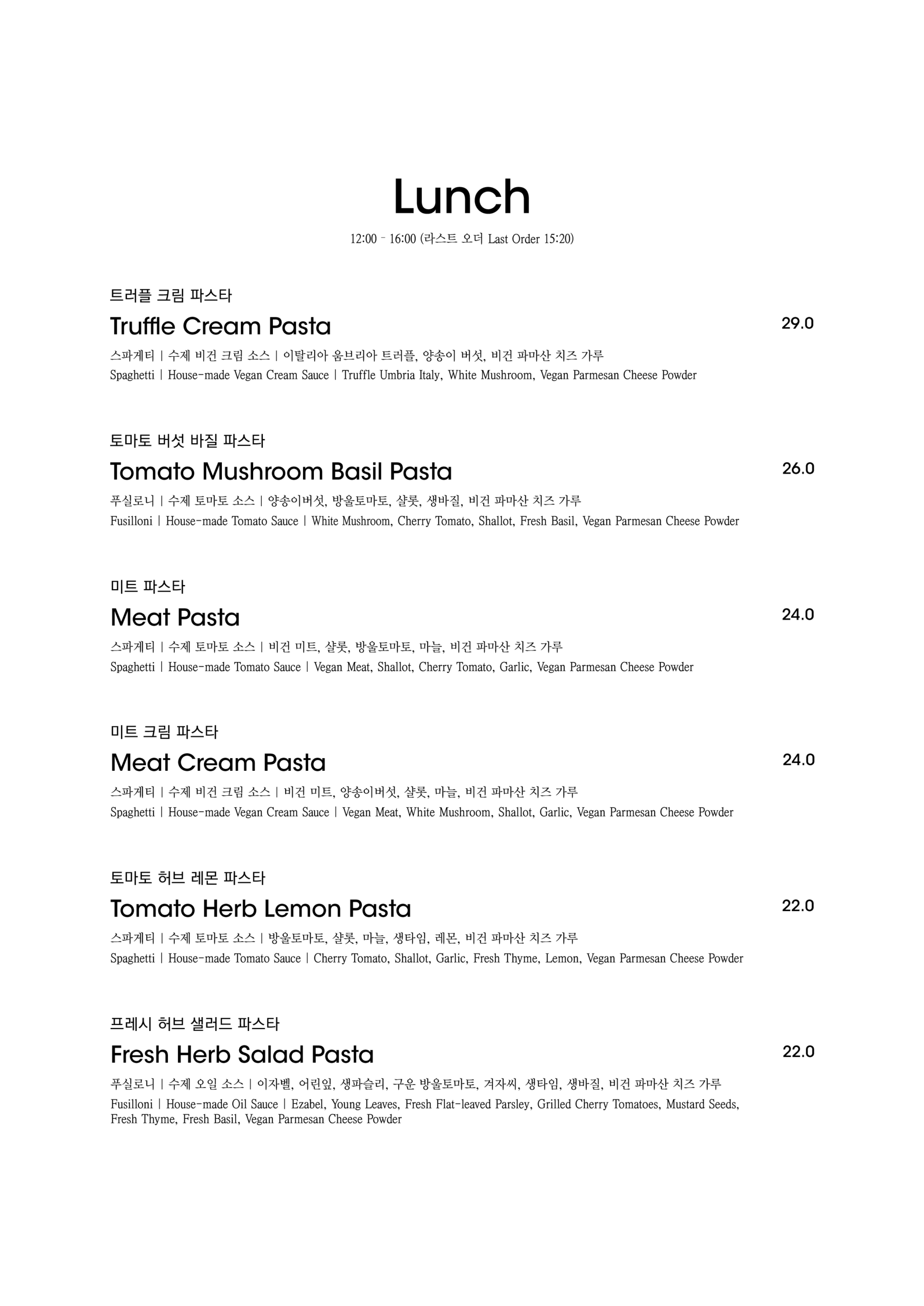 알림: 본 메뉴판의 각 메뉴의 재료는 참고를 위한 주재료 위주의 일부 표기입니다.